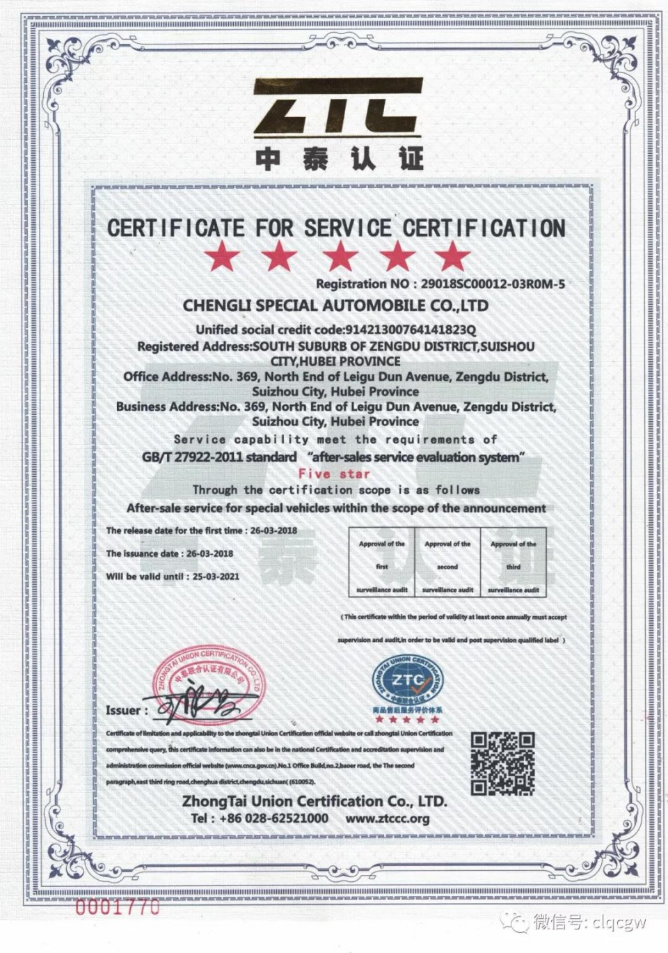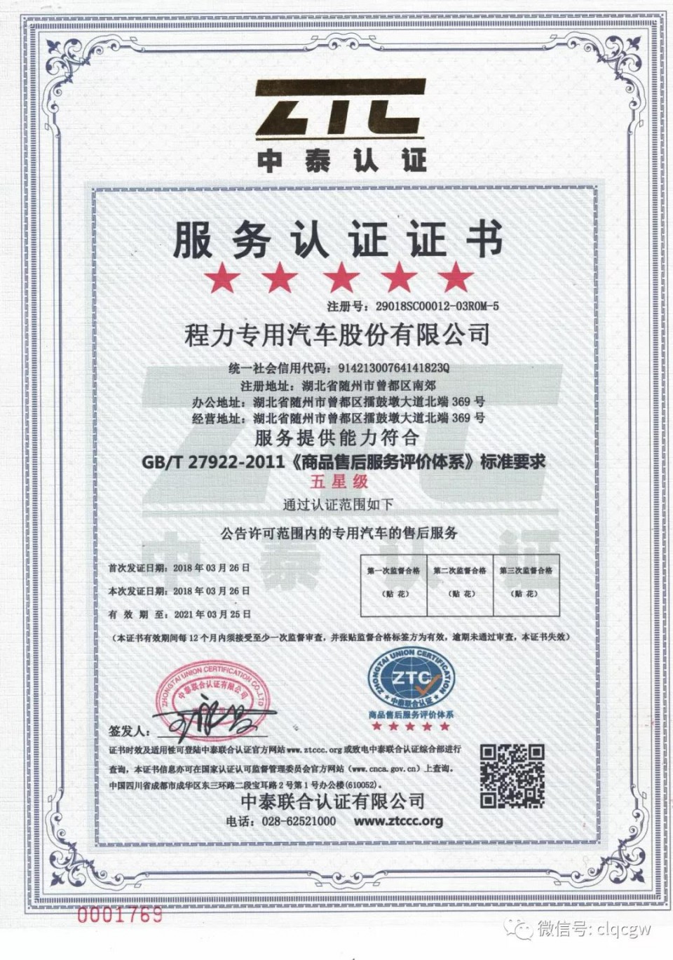 该认证是对程力公司产品质量和售后服务的全面达标的认可,也是产品占领和扩大市场份额的通行证和利器,五星级认证的获得对产品在招投标中将起到积极的作用,是必不可少的加分事项,程力专汽也必将由此获得更大更好的发展。